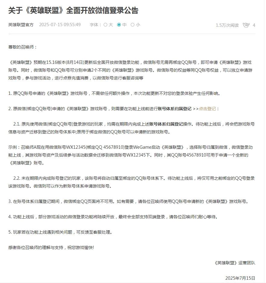 《英雄联盟》预期在15.16版本(8月14日)更新后全面开放微信登录功能,微信账号无需再绑定QQ账号,即可申请《英雄联盟》游戏账号。同时,微信账号和QQ账号可分别申请2个不同的《英雄联盟》游戏账号。微信账号的权益等同QQ账号权益,可以独立申请游戏账号,参与游戏活动,进行点券充值消费,以微信账号进行客服咨询等。