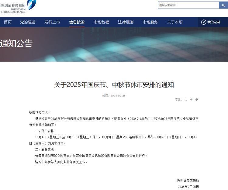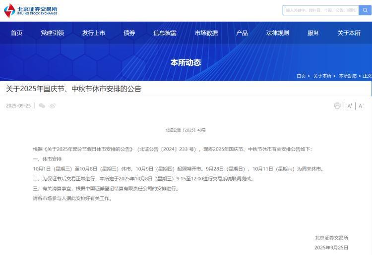 9月25日股票配资官方,沪深北交易所发布关于2025年国庆节、中秋节休市安排的公告。